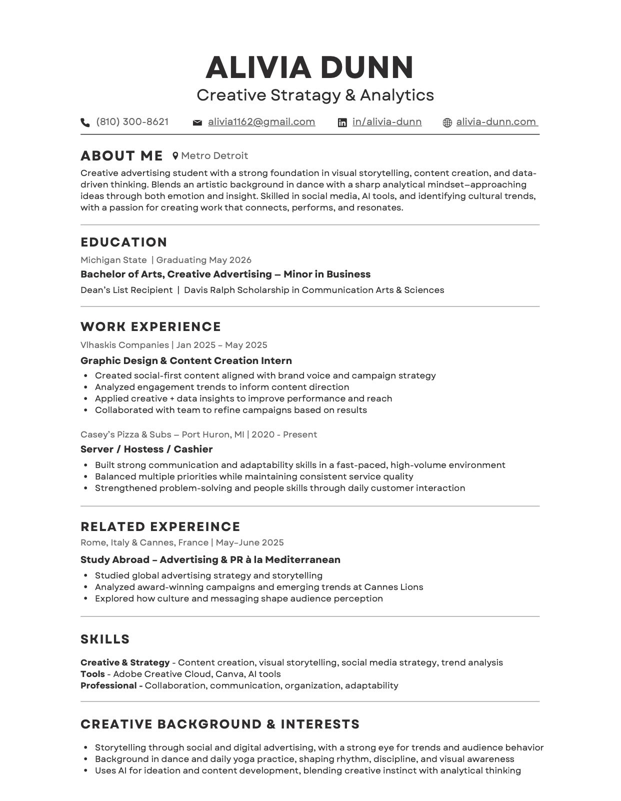 My name is Alivia Dunn and I am a Creative Advertising senior at Michigan State University with a minor in Business. I am an aspiring strategist driven by a lifelong love for storytelling and "reading the wind."